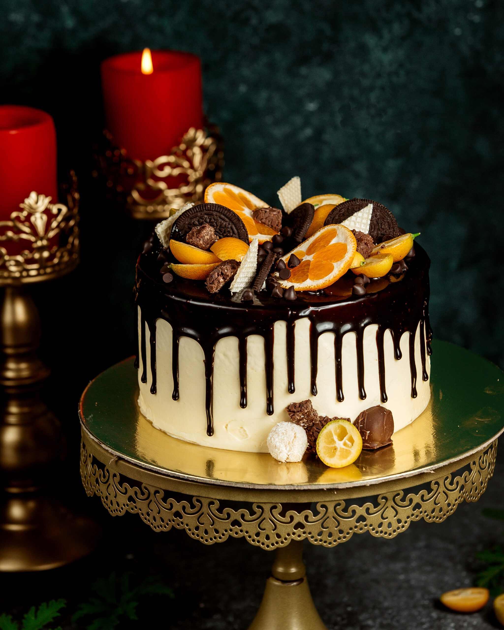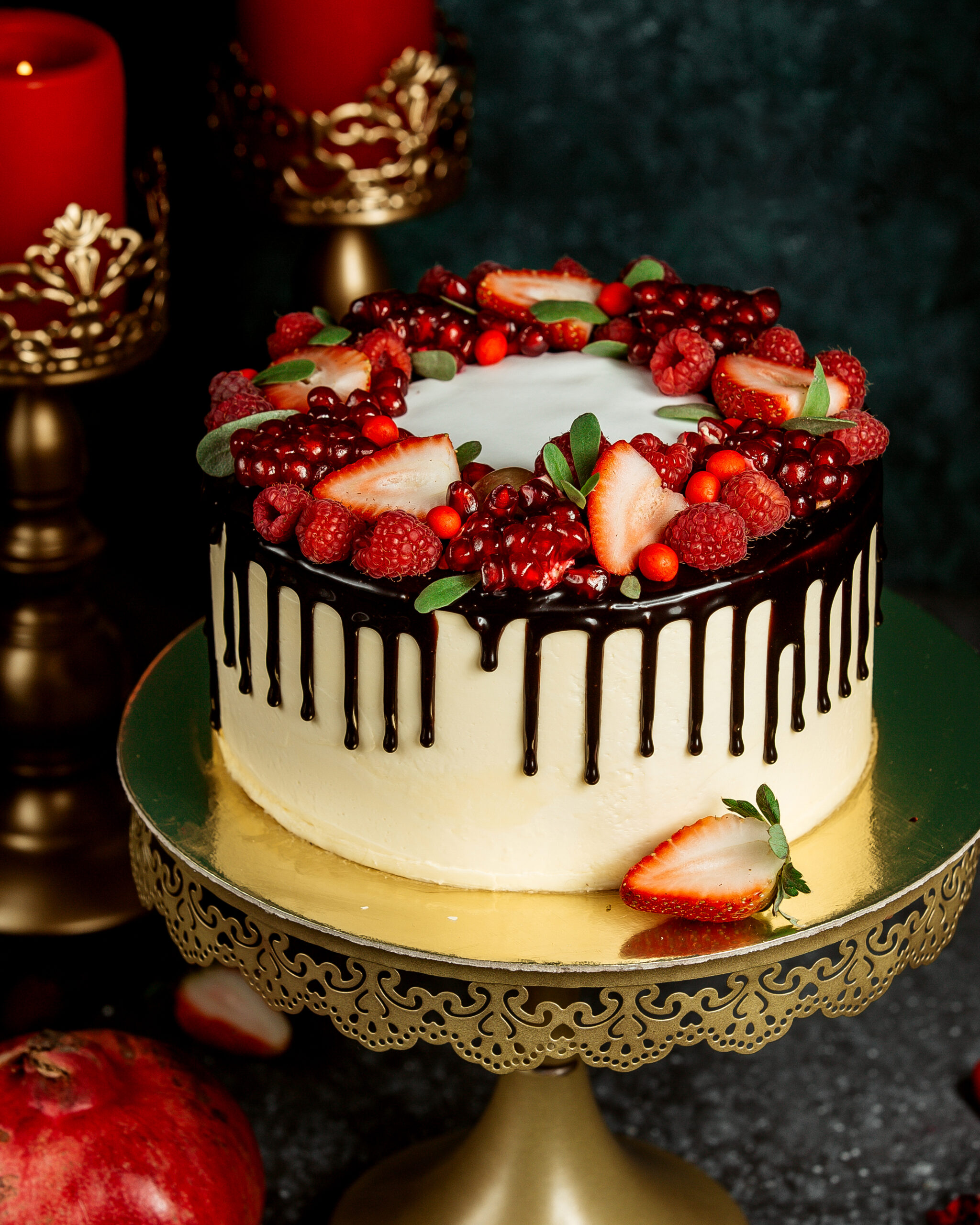 Gallery cherry cake on the table cake stand with chocolate cherry cake and cupcakes chocolate drip cake garnished with orange chocolate cookies and waffles Side vew fruit cake with chocolate chips and blueberries on wood background chocolate drip cake with white cake garnished with berries